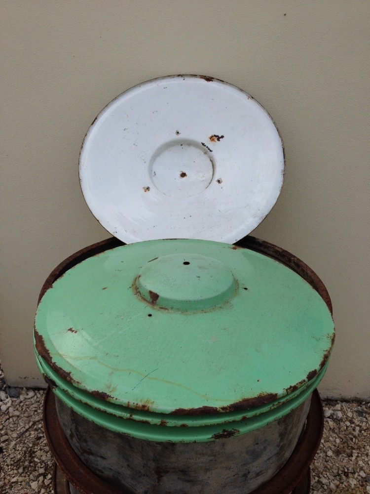 Quattro grossi piatti in metallo smaltato, da mettere il porta lampadina. Diametro 53 € 75 cad